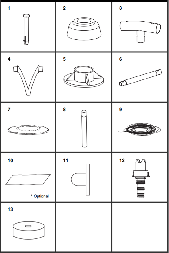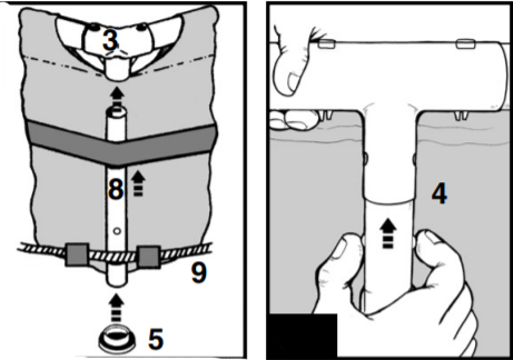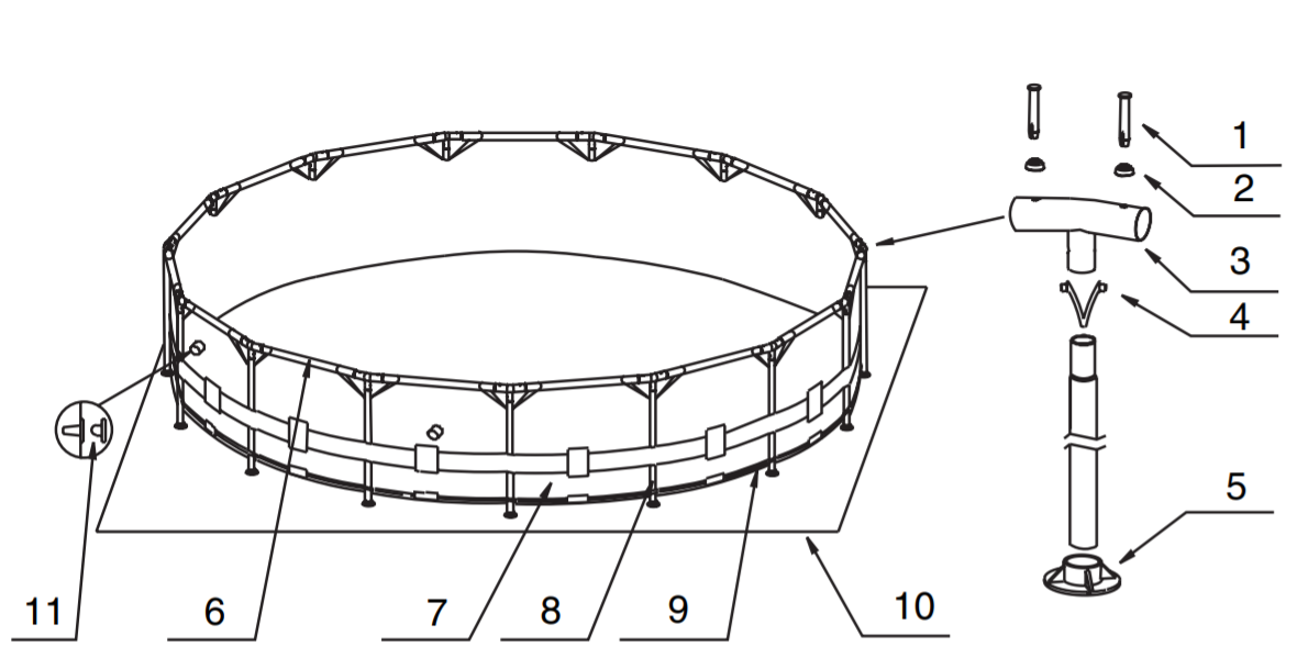 Затем начните собирать т-образные стойки и закреплять их в вертикальных штангах с помощью защёлок. Как только все стойки будет собраны, проденьте горизонтальные штанги в петли бассейна и закрепите их специальным стопором.