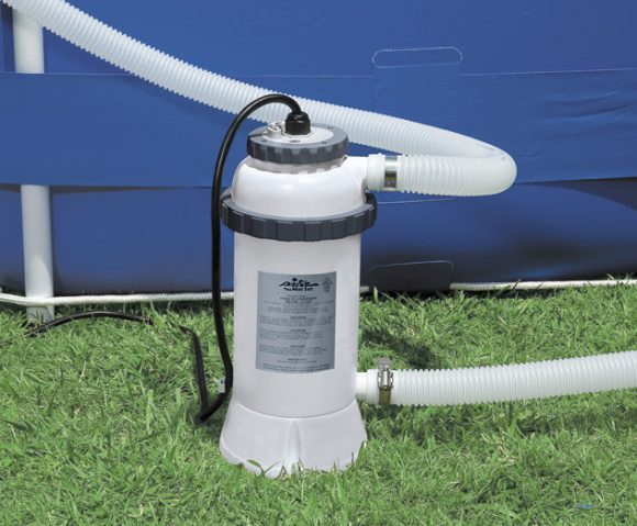 Электрический водонагреватель можно использовать только с теми бассейнами, в которых есть под него технические отверстие. Шланг из водонагревателя присоединяется к этому отверстию с помощью муфт и хомутов. Точно так же, как и к фильтру-насосу.