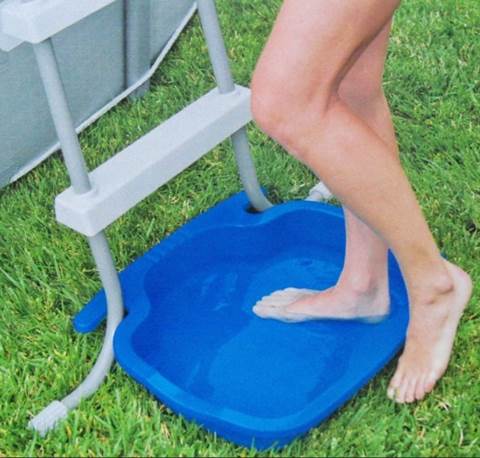 10. Последняя в списке по очередности, но не по важности, ванночка для ног. В отличие от многих других аксессуаров, она нужна не только для души, но и для сохранения чистоты в самом бассейне. Ванночка крепится к подножию лестницы. Она нужна, чтобы сполоснуть ноги перед входом в бассейн, если у вас нет никакой дорожки и ходить приходится прямо по траве. Это нужно, чтобы не нести лишнюю грязь в бассейн. Сама ванночка имеет антискользящее покрытие, ведь на обычном мокром пластике очень легко поскользнуться.